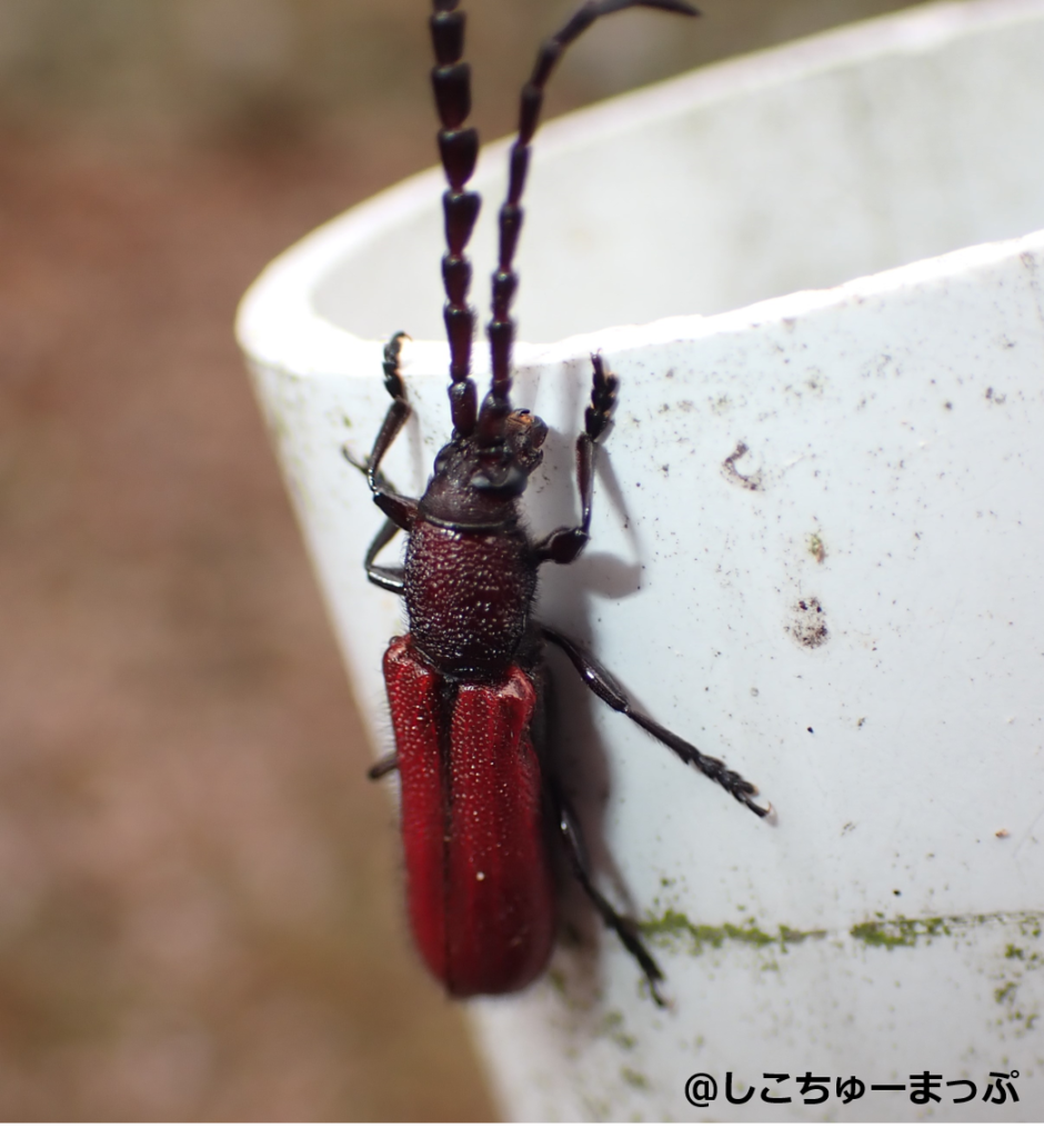 HOME > 四国中央市 > 昆虫類 > 昆虫類 クスベニカミキリ 2021年2月22日 2021年3月22日 ノコギリ状の触角と鮮やかな赤色の体色が特徴のカミキリムシ。カナブンのように内側の羽のみを広げて飛ぶため、飛んでいるときも赤色が目立つ。よく見ると毛深く、体全体に黒くて短い毛が生えている。クスノキなどに集まるとのことだが、今回はポールに休んでいたところを撮影した。 Twitter Share Hatena LINE コメント -昆虫類 -ノコギリ, 赤い甲虫