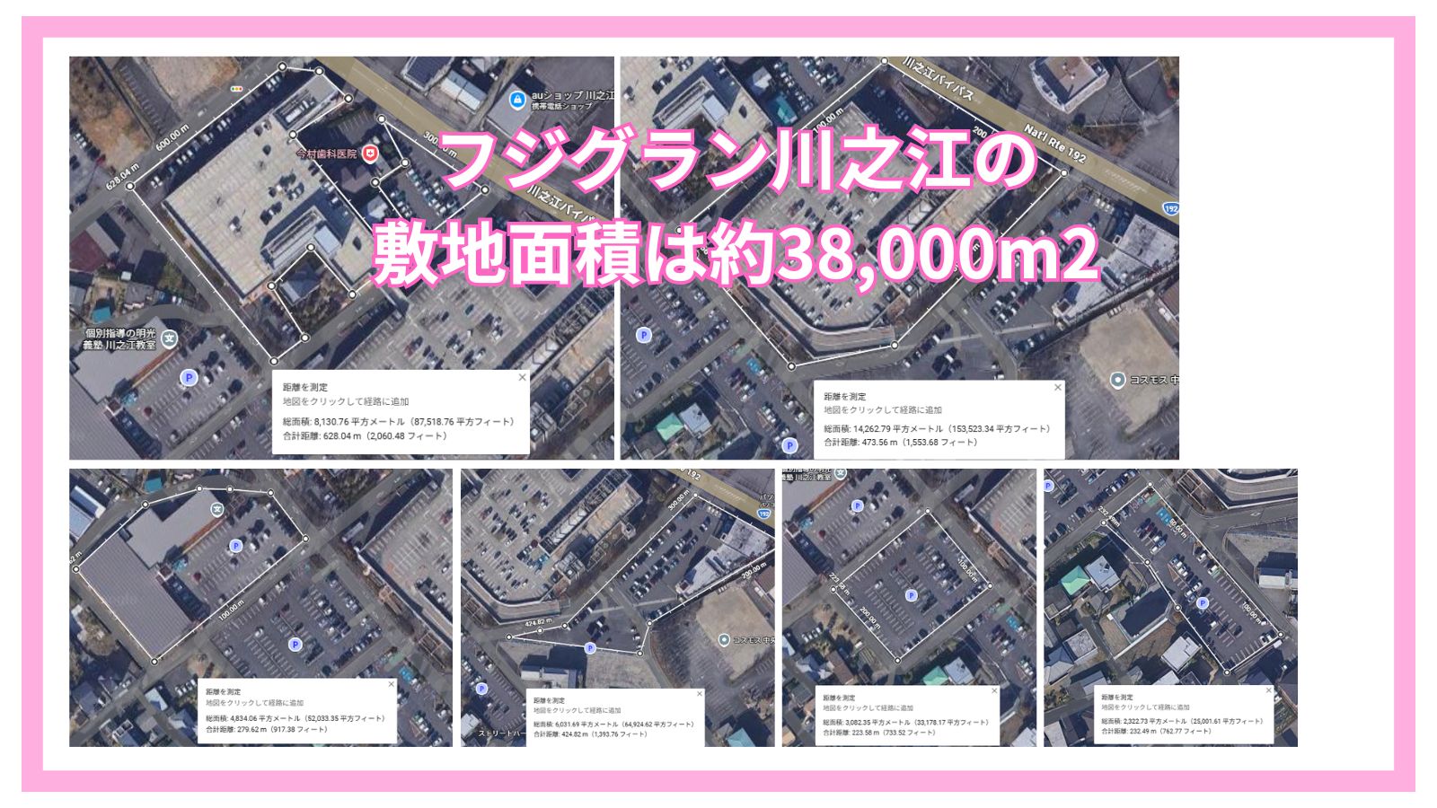 グーグルマップでフジグラン川之江のおおよその敷地面積を調べると、38,000㎡でした。